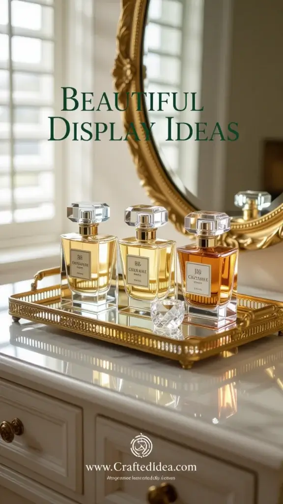 Styling tip: Choose mirrored or metallic trays that complement your room decor. Group bottles by height (tallest in back, shortest in front) for visual appeal. Add a small decorative element like crystals or dried flowers for personality.