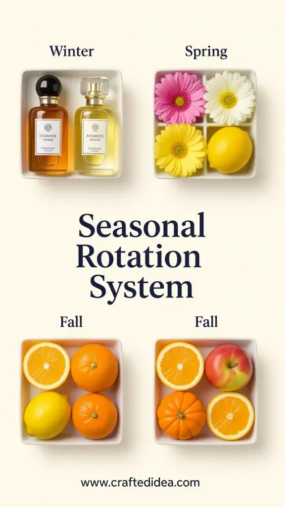 Summer (June-August): Display citrus, aquatic, and light tropical fragrances. Grapefruit, coconut, sea salt. Heavy perfumes stay in storage.